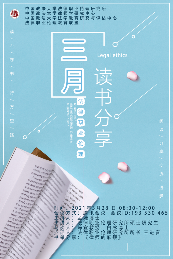 3月28日上午,beat365中国官方网站法律职业伦理研究所成功于腾讯会议在线举办了《律师的麻烦》读书会活动。读书会由孟婕博士主持,陈宜教授、白冰博士作为与谈人,法律职业伦理专业硕士研究生进行内容汇报和分享。其他对于本书感兴趣的师生十余人也参与到读书会中。