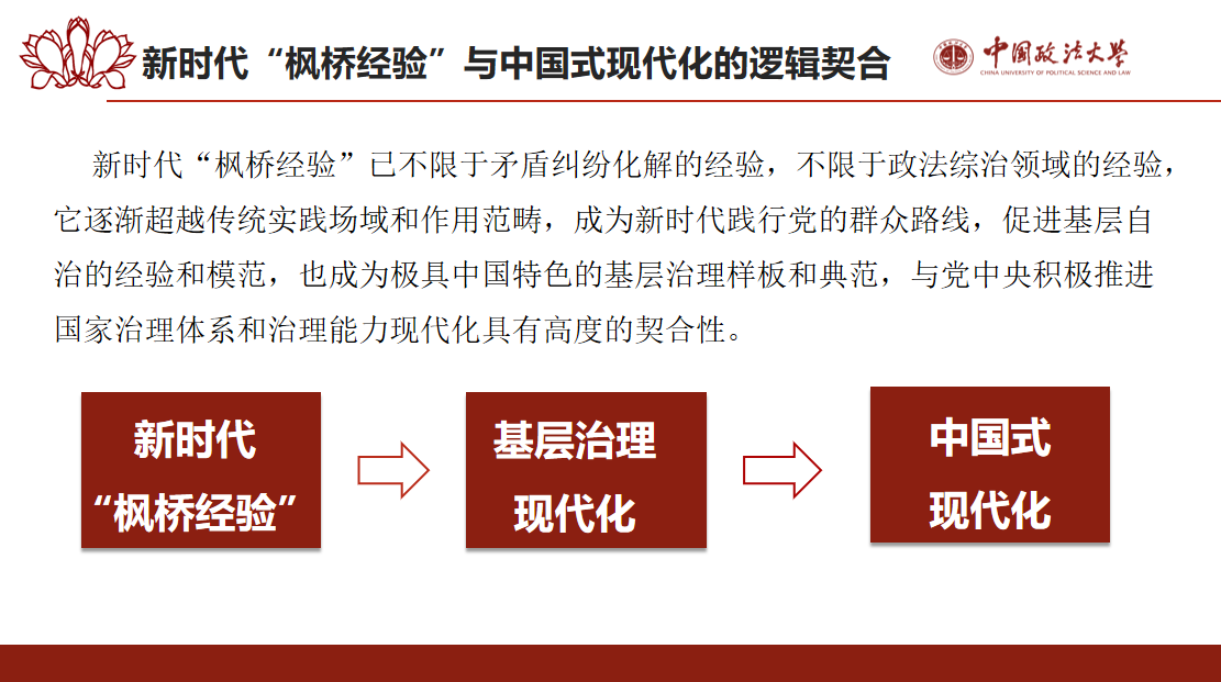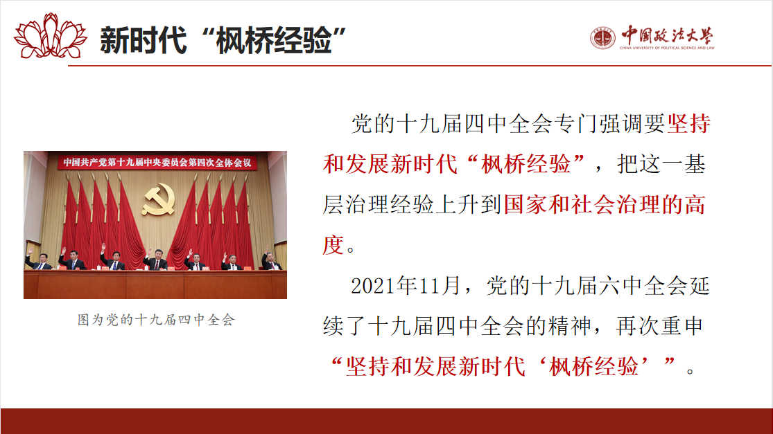 同时,孟祥瑞同志为大家详尽介绍了“枫桥经验”的内涵嬗变与新时代“枫桥经验”的理论意涵。课上讲到,“新时代‘枫桥经验’将地方性基层治理经验创造性转换,将地方文化传统创新性扩展,也在一定程度上将具有中国特色的社会治理经验发扬光大,贡献出符合国情、立足实践的特色方案,成为新时代践行党的群众路线、推进基层治理现代化的经验。”
