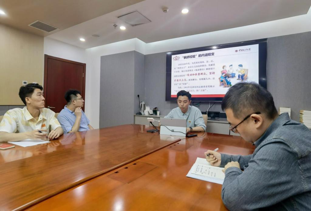 接下来,孟祥瑞同志重点为大家阐释了新时代“枫桥经验”与中国式现代化的逻辑契合,以及新时代“枫桥经验”助推中国式现代化的实践路径等问题。课上指出,“枫桥经验”成为新时代践行党的群众路线,促进基层自治的经验和模范,也成为极具中国特色的基层治理样板和典范,与党中央积极推进国家治理体系和治理能力现代化具有高度的契合性。就实践路径问题,孟祥瑞强调必须坚持党的领导、坚持人民主体地位、坚持自治、法治、德治三者有机融合、坚持多元治理主体共建共治共享。会议最后,孟祥瑞同志号召大家认真学习和深刻领悟新时代“枫桥经验”的科学内涵,立足中国式现代化的实践逻辑,把“枫桥经验”的精髓要义充分运用在未来的科研、学习和工作当中。与会人员亦就党课分享内容发表了自己的感悟和看法。