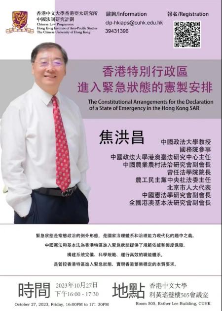 On the afternoon of 27th October, Professor Jiao Hongchang of the Institute of Constitutional Law of the Academy was invited by the Faculty of Law of the Chinese University of Hong Kong to hold a high-end public academic lecture for the doctoral students, master's degree students and some teachers of the Institute of Asia-Pacific Studies (IAPS), presided over by Professor Xi Chao, Vice Dean of the Faculty of Law.