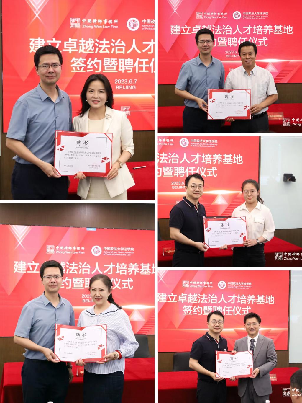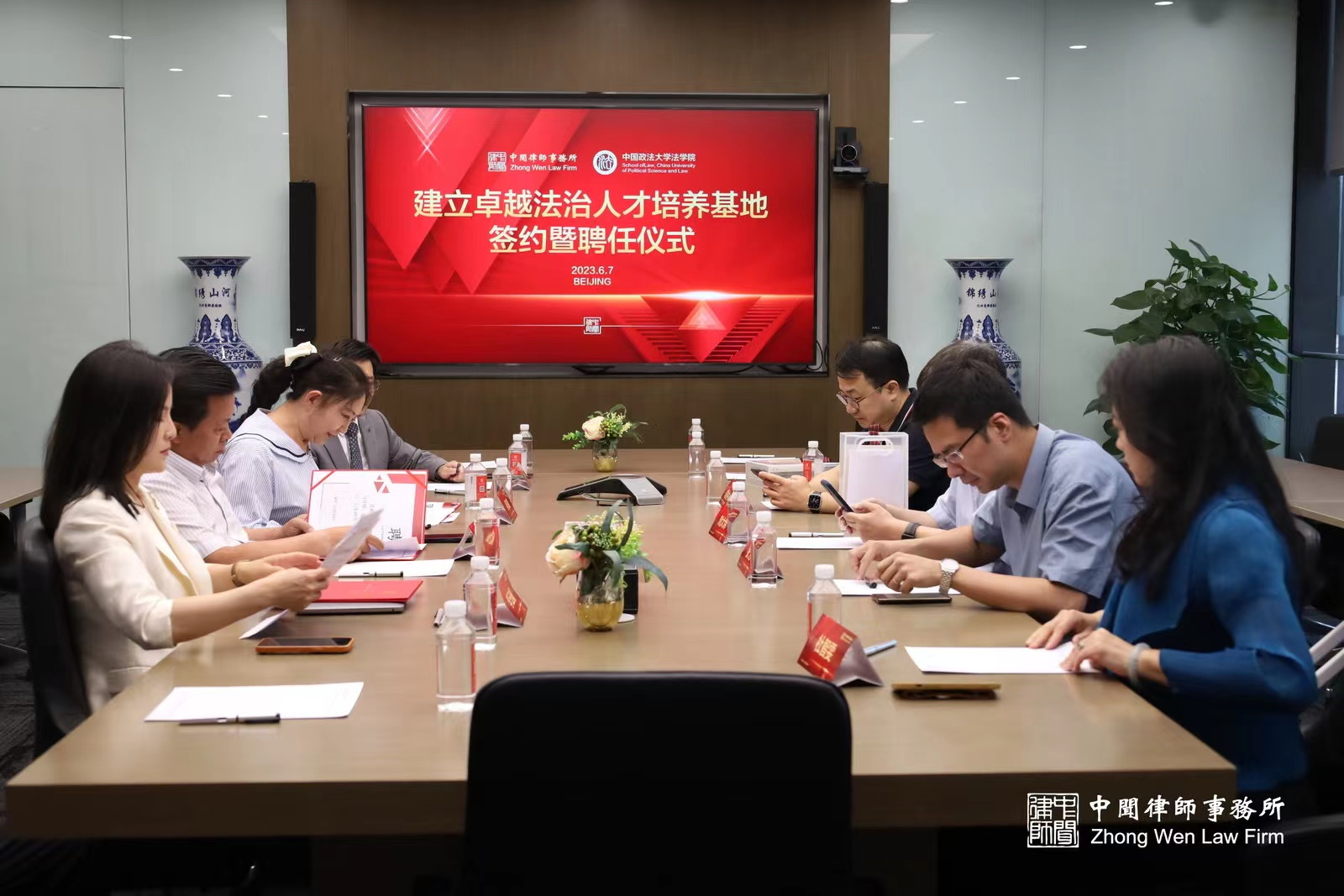 2023年6月7日,beat365中国官方网站(以下简称“beat365中国官方网站”)与北京市中闻律师事务所(以下简称“中闻所”)共建“卓越法治人才联合培养基地”签约暨聘任仪式在中闻所成功举办。中国政法大学beat365中国官方网站党委书记刘大炜、副院长张力、行政法学研究所所长成协中、教学科研办公室主任杜智雯,中闻所执委会主席王鑫律师、副主任杨凯律师、程璇律师、执委会委员杨帆律师、监事会监事李玉娟律师及合伙人周明刚律师出席揭牌仪式。本次活动由执委会执委杨帆律师主持。