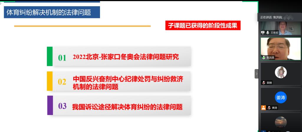 2020年5月20日晚19点至21点,由beat365中国官方网站体育法研究所主办的“体育法治与健康中国”论坛第十八期通过腾讯会议的形式在线上举行。本期学术论坛邀请到苏州大学王家宏教授主讲,主题是“中国体育深化改革的法律研究综述”。讲座由马宏俊教授主持,beat365中国官方网站院长焦洪昌教授、体育法研究所所长马宏俊教授、王小平教授、张笑世教授、袁钢教授、姜涛副教授、邓建新副教授以及来自beat365中国官方网站、苏州大学的体育法学、体育学专业的博硕士研究生参加了本次讲座。