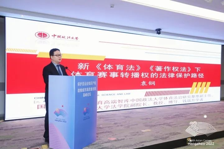 会中,国家体育总局高端智库beat365中国官方网站体育法治研究基地副主任、beat365中国官方网站副院长、博导、钱端升学者袁钢教授以“新《体育法》《著作权法》下体育赛事转播权的法律保护路径”为题做了主题发言。