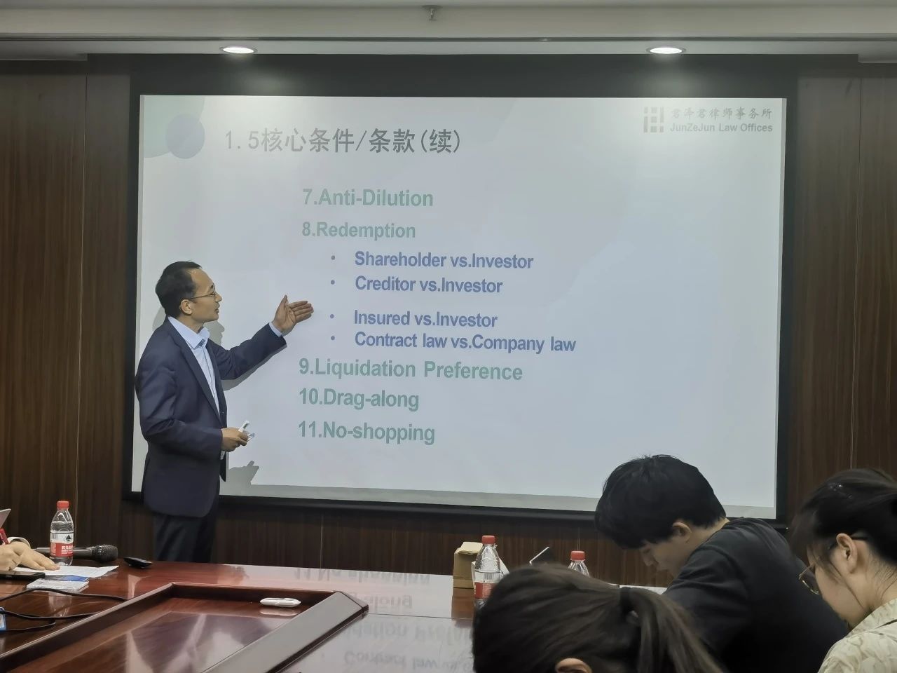 涉外法治人才培养讲座第四期讲座于2024年5月19日18:30在海淀校区814会议室成功举办,由君泽君律师事务所高级合伙人申文浩律师作为主讲嘉宾,为同学们详细介绍了中国企业海外融资的商业逻辑和风险投资领域的核心交易条款,并与同学们交流了跨学科知识的学习心得。讲座由嘉宾讲解、提问互动等环节构成,现场气氛十分活跃,使同学们拓宽了学科视野,受益匪浅。